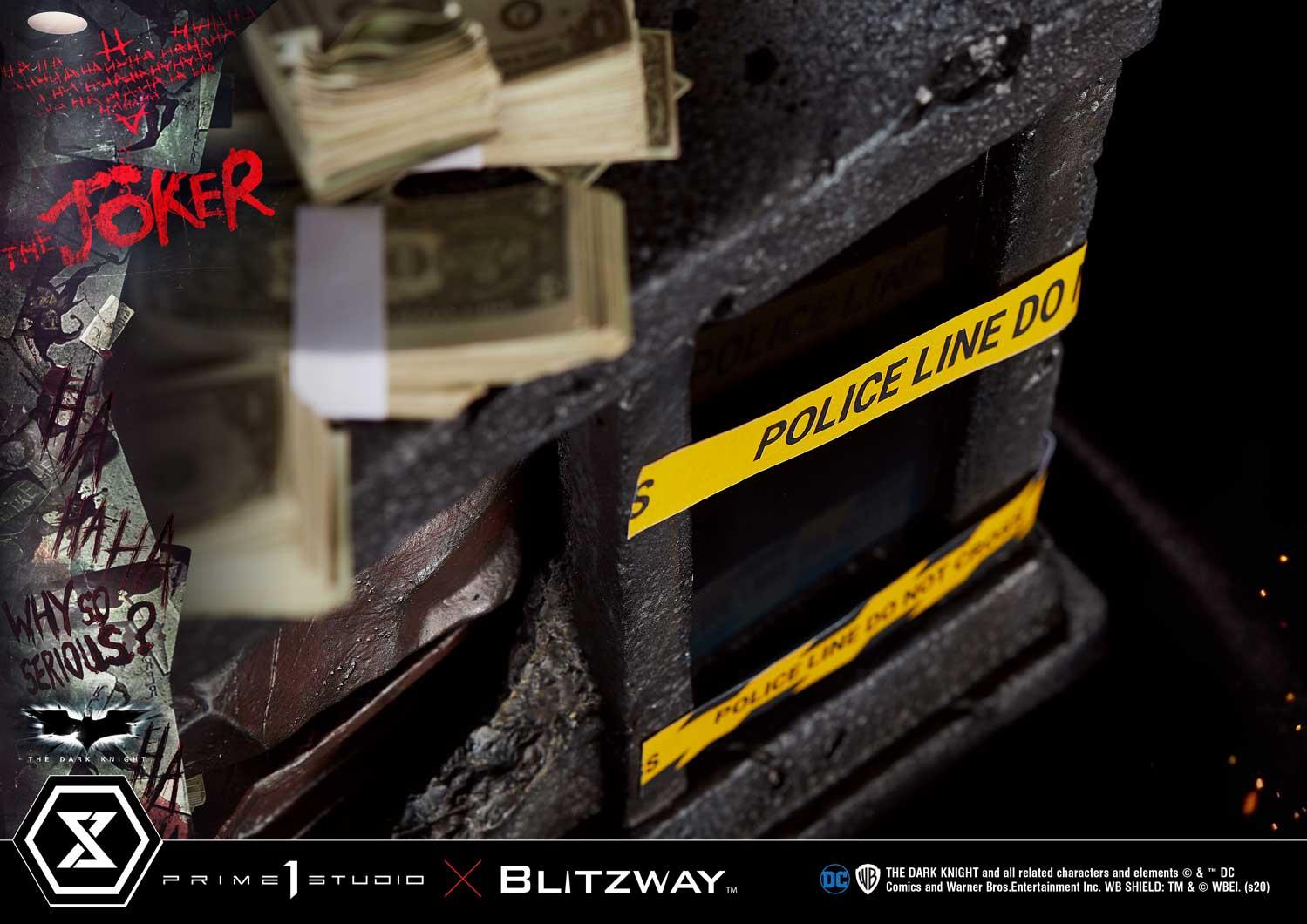 - Nine (9) movable props: Joker Card, Knife, Machine Gun, Gasoline Cans, LED Illuminations emergency lights, Detachable Grenades, Bundles of Cash, Burned Money, Police Tape Lines.