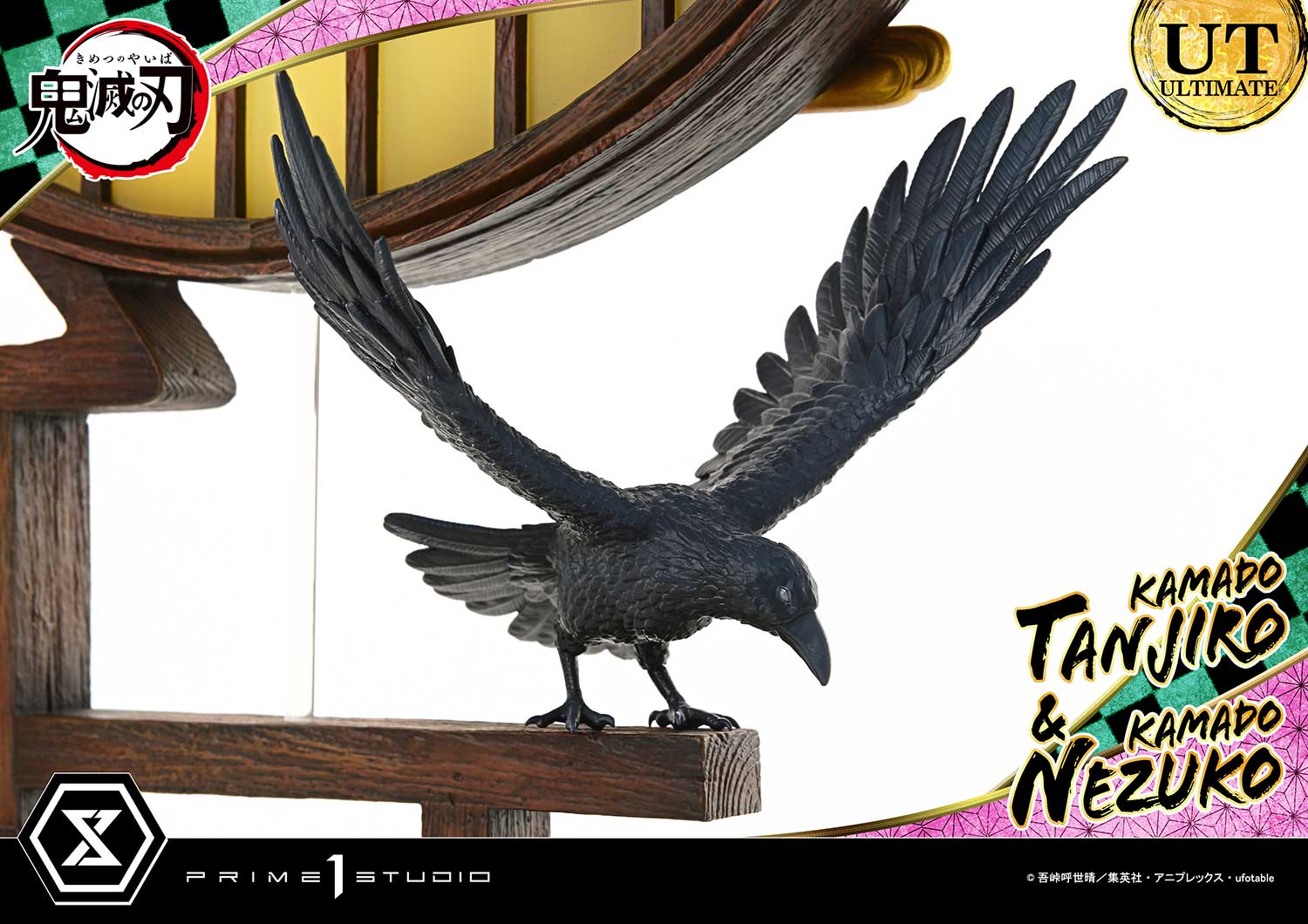 Swappable head parts allow different expressions—Tanjiro biting down in determination, Nezuko consumed by anger. Nezuko also comes with an alternate arm manifesting her Blood Demon Art: Bakketsu (Exploding Blood). Adding further depth is a background stand featuring motifs from the series, including a shoji screen and the loyal Kasugai Crow, enhancing immersion into the world of "Demon Slayer: Kimetsu no Yaiba."