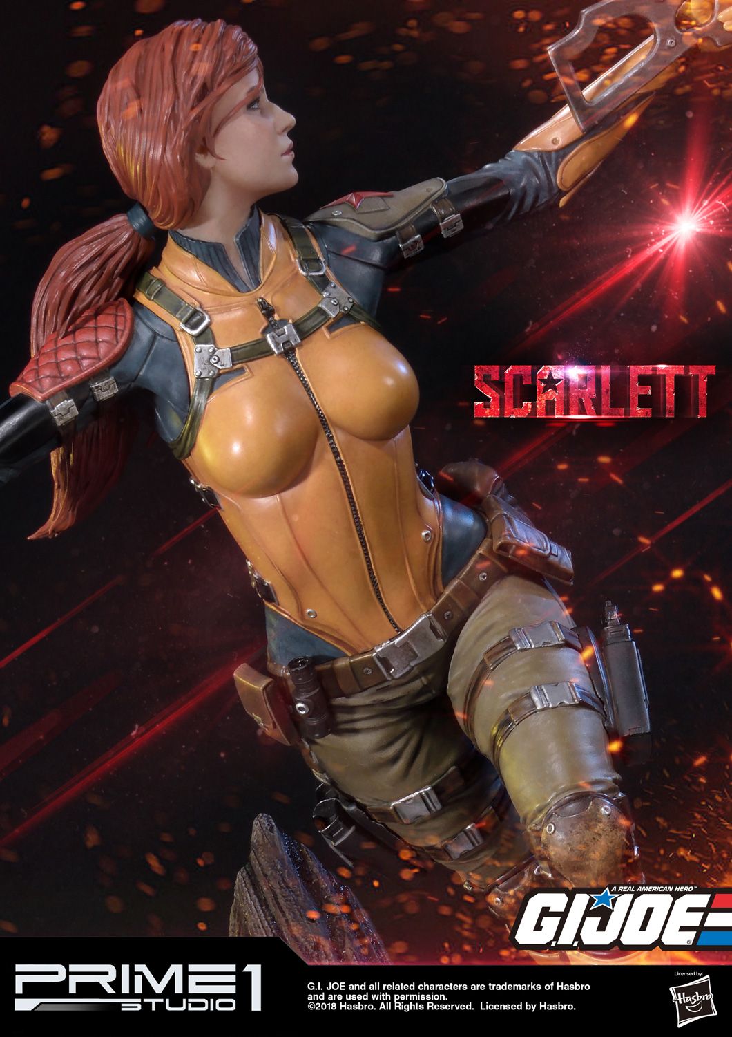 Prime 1 Studio is proud to present the 1:4 scale PMGJ-05: Scarlett from G.I. Joe. Shana O’Hara also known as Scarlett is one of the original members of the G.I. Joe Team. Her primary specialty for the team is counter intelligence. Scarlett is additionally skilled in martial arts and acrobatics. She is always portrayed as an athletically built, yet shapely, woman with a beautiful face and long red flowing hair. Although she is as adept with standard weapons as any of her comrades, her weapon of choice is the XK-1 Power Crossbow, which fires various bolts with specialized functions.