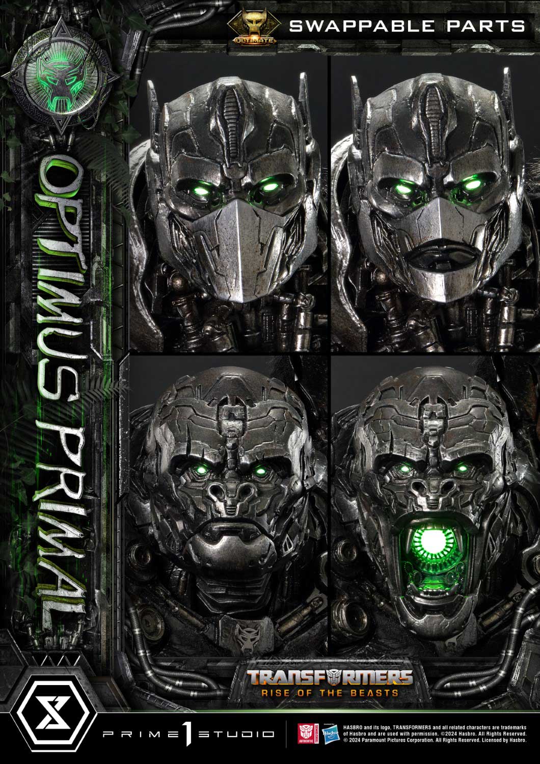 The Ultimate Version takes this piece to a whole new level with the addition of a swappable base featuring Optimus Primal’s magnificent beast mode. Towering atop a lifeless Scorponok and surrounded by lush jungle vegetation, this base showcases his unyielding strength and victorious spirit, blending organic and mechanical elements in a visually captivating manner. Added swappable head parts offer expanded storytelling, including two variations for each form, all featuring LED illumination in the eyes and mouth.